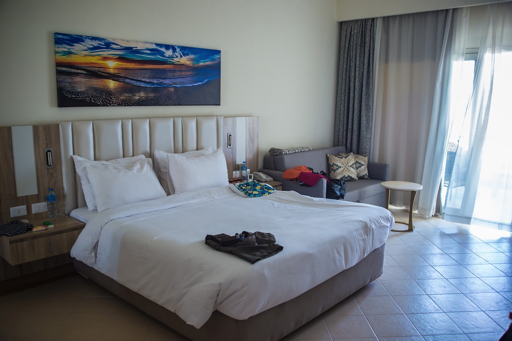Das "Dana Beach Resort" in Hurghada hatte 5 Sterne und lag direkt am privaten Hotelstrand. Es hatte über 800 Zimmer, viele Pools, Restaurants und Bars, zwischen denen man freie Wahl hatte. Mit Bootstaxis in der künstlichen Lagune konnte man sich jederzeit von einem Punkt der Anlage zu einer anderen fahren lassen. Unser (Deluxe)Zimmer hatte eine jederzeit gefüllte Mini-Bar, einen großen Flat-TV, Masserkocher, Safe, Doppelbett, eine zusätzliche Schlafcouch, einen riesigen Balkon mit Meerblick, ein riesiges Bad mit Bidet und alles was man für einen schönen Urlaub braucht. Das WLAN war ebenfalls kostenlos.