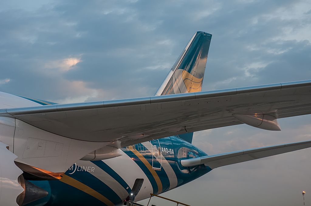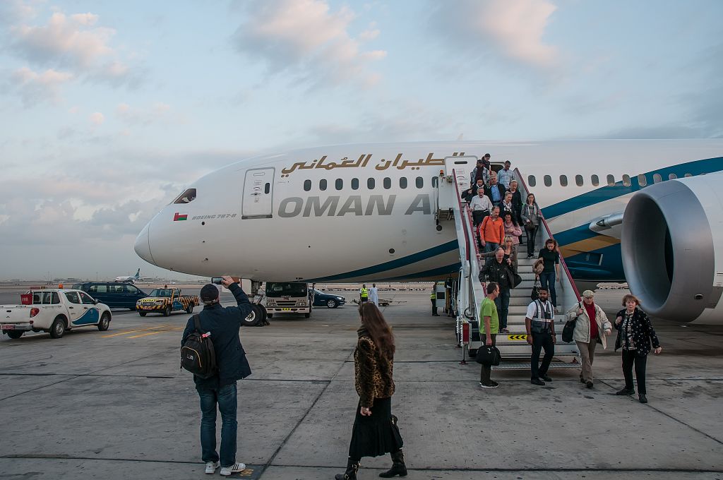 Wir suchten das Terminal der Oman Air checkten dort ein. Der Flug in den Oman fand mit einem nagelneuem Boeing 787-8 Dreamliner statt. Dieser ist mit einer 3-3-3 Bestuhlung in der Economyklasse ausgerüstet, so dass es uns egal war, wo wir saßen. Wir bekamen eine Mittelbank für uns beide allein.