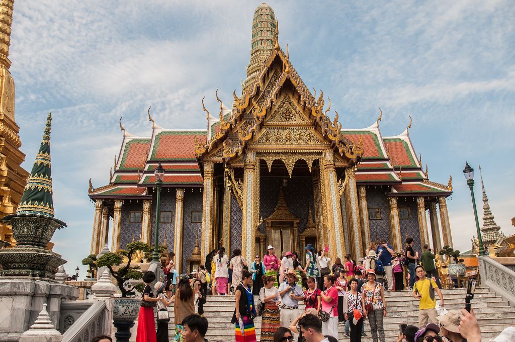 Wir hatten den Palast bereits vor 5 Jahren besichtigt, aber damals war es nicht so voll wie an diesem Tag. Zum Glück lagen einige Wolken über der Stadt, so dass man gelegentlich nicht in der prallen Sonne stand und von den Menschenmassen vorwärts geschoben wurde. Am beeindruckendsten im Königspalast ist natürlich die Tempelanlage mit den vielen vergoldeten Statuen und kunstvoll mit Mosaik, Spiegeln und Gold verzierten Gebäuden.