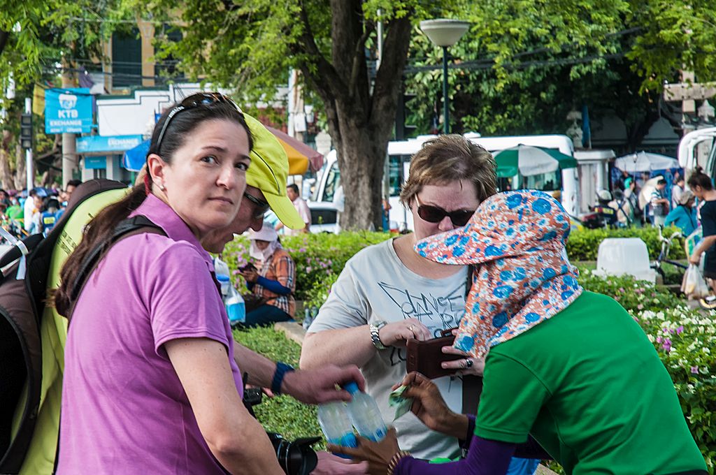 Als wir durchgeschwitzt den Königspalast wieder verließen, brauchten wir erst mal was kaltes zu trinken (und ich endlich eine Zigarette, da im Palast das Rauchen verboten ist). An einem Marktstand versorgten wir uns daher erst mal mit auf zerstoßenen Eisblöcken gekühltem Wasser und Cola.