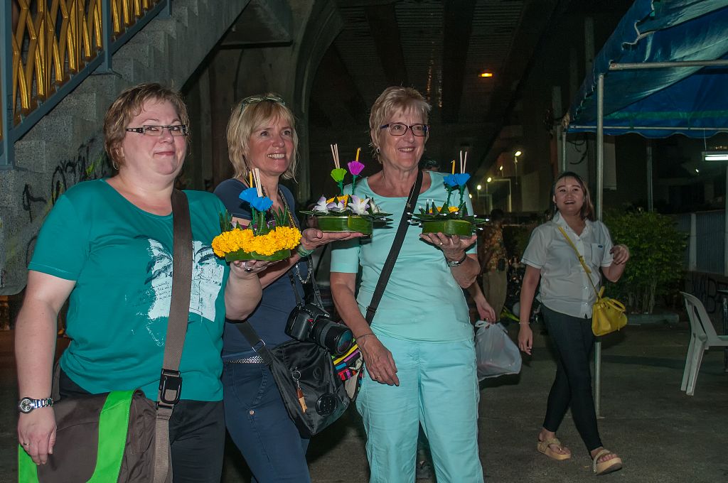 Zusammen gingen wir in Richtung Fluss. Unterwegs kauften wir uns jeder einen Kraton, der Kunstvoll aus Blumen und Blättern gebunden war. Dann gingen wir zum Fluss um die Räucherstäbchen und Kerzen des Krathong anzuzünden und ihn in dem Fluss auszusetzen. Die 3 Räucherstäbchen unseres Kratons brannten schnell, aber die Kerze ging immer wieder aus.