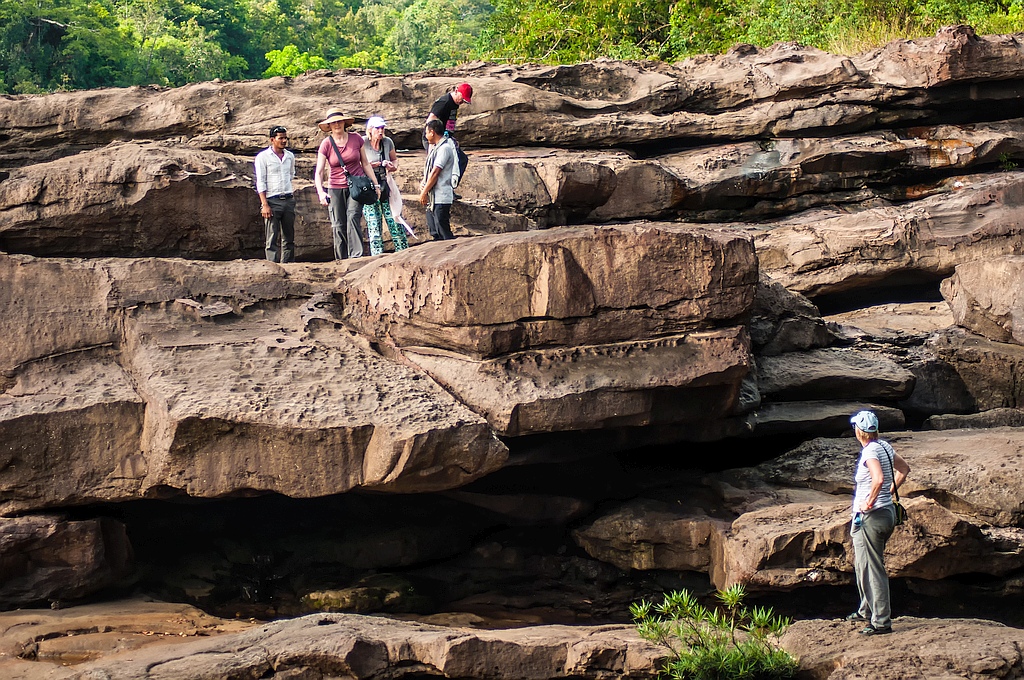Hier im Nationalpark soll es angeblich Tiger und Elefanten und vieles mehr geben, aber unser Reiseleiter Ho versicherte uns, dass er hier noch nie ein Tier gesehen hätte. Wenn wir Tiere sehen wollten, müssten wir eben nach Afrika reisen. Die Fahrt endete an einem kleinen Wasserfall. Einige blieben im Boot und wir anderen machten uns auf zur heutigen "Dschungelwanderung". Schon nach 10 Minuten durch den Dschungel waren wir zur oberen Spitze des Wasserfalls vorgedrungen. Der Weg war zwar schwierig, aber wir hatten uns alle mehr von der Wanderung versprochen. Tiere gab es natürlich auch nicht zu sehen. Somit ging es wieder