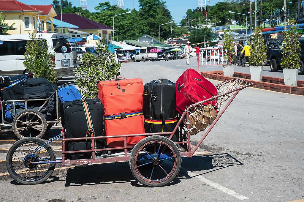 Auf Handwagen wurden unsere Koffer über die Grenze nach Thailand gebracht.