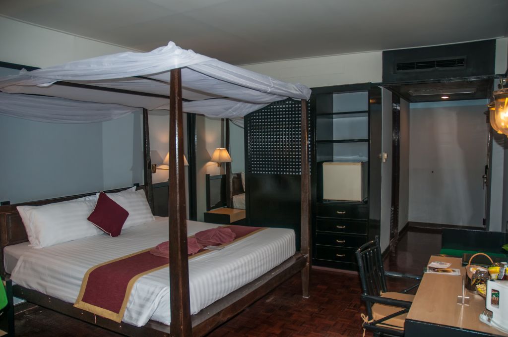 Das Zimmer war ausgestattet mit einem grossen Doppelbett, Holzboden, einer altersschwachen Klimanlage, TV, Minibar, Schreibtisch (mit Steckdose!) und einer Terasse mit Sitzgelegenheiten.
