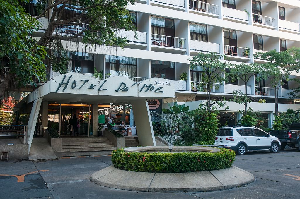 Das "Hotel De´Moc" in Bangkok lag recht zentral und hatte 3 Sterne. Unser Zimmer 516 lag in der 5. Etage und war ausgestattet mit einem Balkon mit 2 Sitzgelegenheiten, und Blick auf eine Schnellstrasse und ein leerstehendes Hotel, einer funktionierenden Klimaanlage, die auch nach entfernen der Karte zum öffnen der Tür weiter lief, Parkettboden, einer gefüllten Minnibar, Himmelbett mit Moskitonetz, einem Schreibtisch, Flachbildschirm und einer Sitzcouch. In die Steckdosen passten EU Normstecker.