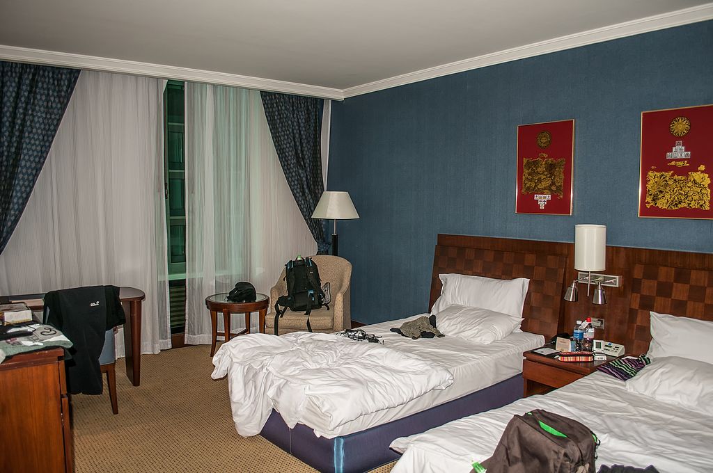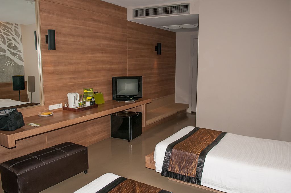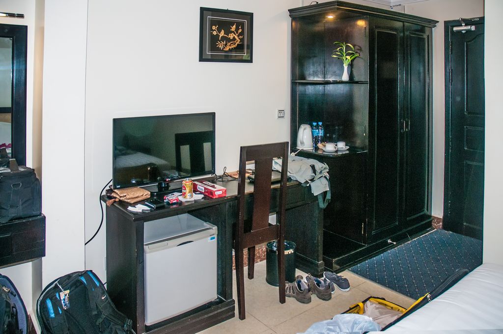 Unser Zimmer 204 war recht groß aber leider gab es keinen Balkon. Als Ausstattung gab es einen funktionstüchtigen aber leeren Kühlschrank, einen alten Röhrenfernseher, Einzelbetten, Fliesenboden und warmes Wasser in der Badewanne, in die auch das Abwasser der Kimaanlage hinen tropfte.