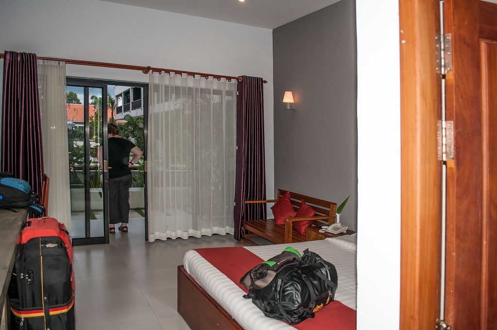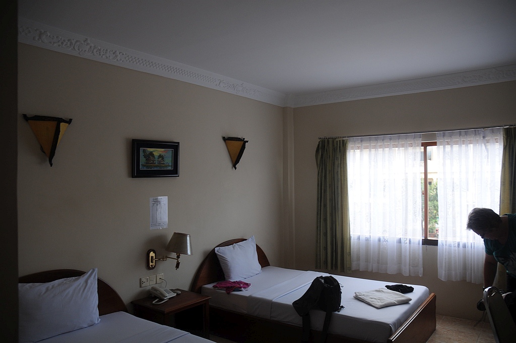 Das "New Riverside Hotel" in Siem Reap machte seinem Namen alle Ehre. Es war erst neu eröffnet worden. Unser Zimmer im Erdgeschoss war gross, hatte eine Terrasse mit Liegestühlen und direktem Zugang zum Pool, Fliesenboden, Doppelbett, Bad mit Dusche, Flachbildschirm, Klimaanlage mit Fernbedienung, schnelles und kostenloses WLAN (WPA2 Verschlüsselt) und auch genug Steckdosen. Es gab sogar einen kostenlosen TukTuk-Service zur City.