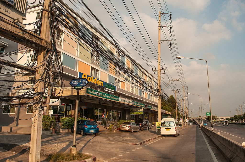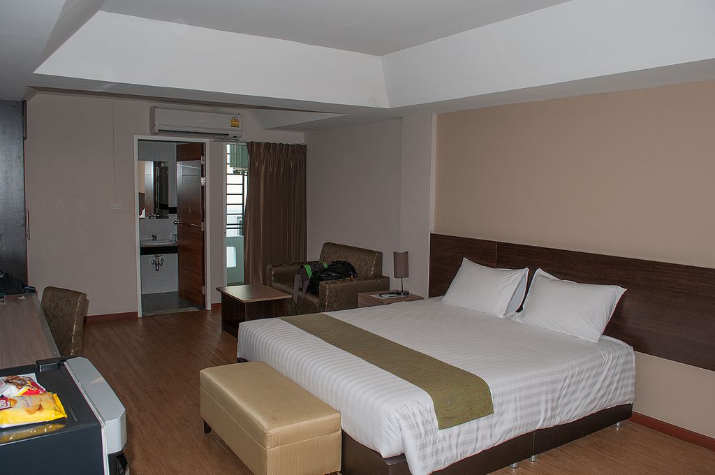 Das "Hotel Golden Jade" in Bangkok lag in der Nähe des Flughafens an einer breiten und stark befahrener Hauptstrasse. Drum herum war nur ein Frisör und ein Laden für Gasflaschen so wie ein ein Massageladen zu finden. Es sah von aussen nicht sonderlich einladend aus, doch waren die Zimmer recht groß und gut ausgestattet. Wir hatteten ein Doppelbett, Laminatboden, eine gefüllte Minnibar, 1,5 x 1,5 m Balkon (reichte, um eine zu rauchen) und einen grösseren Flat-TV, Die Dusche hatte praktischer Weise zwei Duschköpfe. Aus dem einen kam das kalte, aus dem anderen das warme Wasser. Gewöhnungsbedürftig, funktionierte aber prima.