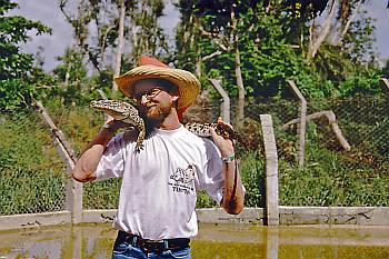 Einmal ein richtig fernes und weit entferntes Land erleben. Einmal im Leben was anderes als den üblichen Pauschalurlaub in Spanien, der Türkei oder Griechenland. Das war unser Traum. Natürlich wollten wir dabei keinen Badeurlaub machen, sondern auch das Land und die Leute kennenlernen. Da wir bisher in unseren Urlauben immer die Gegend mit einem Leihwagen erkundet hatten und wir 'richtige' Rundreisen im Katalog für unbezahlbar hielten, wollten wir es dieses mal wieder genauso machen, wie zuvor. Unsere Wahl fiel auf die Karibikinsel Cuba... Wir buchten also im Sommer 2002 eine 2-wöchige Pauschalreise mit "Alltours" auf die Halbinsel Hicaco. Ziel war das all Inclusive Ibero-Star Hotel "Bella Costa" nahe bei dem Ort Varadero. Als wir nach einem über 10-stündigen LTU-Charter-Flug von Düsseldorf auf Cuba landeten, fühlten wir uns am Ziel unserer Träume. Schnell stellten wir aber fest, das die touristisch extrem erschlossene Halbinsel Hicaco eigentlich nichts mit dem wirklichen Kuba gemeinsam hat. Die Halbinsel durfte von Einheimischen nur betreten werden, wenn diese dort wohnten oder arbeiteten. Es gab eine regelrechte Grenzstation auf der einzigen Zufahrtsstrasse. Auch liefen am Strand immer unauffällige Herren in schwarzen Anzügen umher, die über die Sicherheit der Touristen wachten. Der Strand war aber trotzdem der schönste, den wir je gesehen hatten. Er bestand aus weissem Korallensand und das Wasser hatte die Temperatur einer Badewanne. Nach 2 Tagen waren wir aber den Strand leid. Wir mieteten uns daher einen Motorroller im Hotel (ein ziemliches Wrack, aber er fuhr) und erkundeten damit den Rest der Halbinsel. Es gab viel zu Erkunden, wie die " Cueva de Ambrosia " oder die " Case de Al Capone ", aber das wahre Cuba hatten wir dadurch noch immer nicht erlebt. Es musste also ein Auto her. Einen Leihwagen zu bekommen war kein Problem. Mit dem Wagen (der anhand der Farbe der Nummernschilder und des neuwertigen Zustandes sofort als solcher zu erkennen war) verliessen wir erstmals die Halbinsel und besuchten unter anderem die Orte Matanzas und Cárdenas. Hier erlebten wir nun endlich das wahre Kuba und den real existierenden Kommunismus. Das Witzige bei der Rückgabe des Leihwagens war, dass keiner nach neuen Beulen und Kratzern suchte. Es wurde nur nachgesehen, ob wir nicht das Reserverad verkauft hatten. Danach wollten wir natürlich noch mehr von Kuba sehen. Also buchten wir im Hotel eine Busstour in die Zaparta-Sümpfe und an die Schweinebucht. Nun ging es richtig los. Ein Bus brachte uns in den Süden zu einer Speedboot-Fahrt durch die Sümpfe und der Erkundung Kubas. Der Besuch der geschichtsträchtigen Schweinebucht und der dortigen Krokodilfarm waren eindrucksvolle Erlebnisse. Aber das reichte uns noch immer nicht. Wir wollen noch mehr von Kuba sehen und erleben. Also buchen wir eine weitere zwei tägige Busstour nach Havanna und Pina del Rio. Nun erlebten wir wirklich "Cuba live". Wir besichtigten Havanna mit allen seinen Sehenswürdigkeiten wie den Friedhof "Necropolis de Colon" und das "Castillo de Morro", gingen abends in das berühmte "Cabaret Tropicana" und übernachteten in einem uralten Hotelzimmer (ohne Fenster) in der Altstadt direkt am Hafen. Am nächsten Tag ging es weiter nach Westen und wir besuchten "Pina del Rio". Dort besichtigten wir die dortigen Zigarrenfabriken und natürlich auch die tolle Landschaft. Viel zu schnell war dieser Traumurlaub zu Ende und wir flogen wieder Heim. Nach dieser ersten Traumreise begannen wir aber sofort neue Pläne zu schmieden. Im nächsten Jahr also wieder mal nach Spanien oder doch noch "einen drauflegen" ? Wie es weiter ging steht in unserem nächste Reisebericht... Hier einige Fotos von der ersten 'Traumreise' : (Hiermit entschuldige ich mich für die teilweise schlechte Qualität der Bilder. Die Fotos wurden von alten, analogen Dias gescannt.) | |||||||||