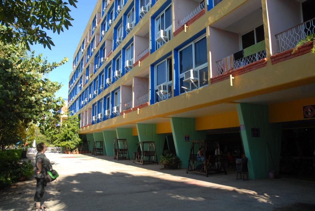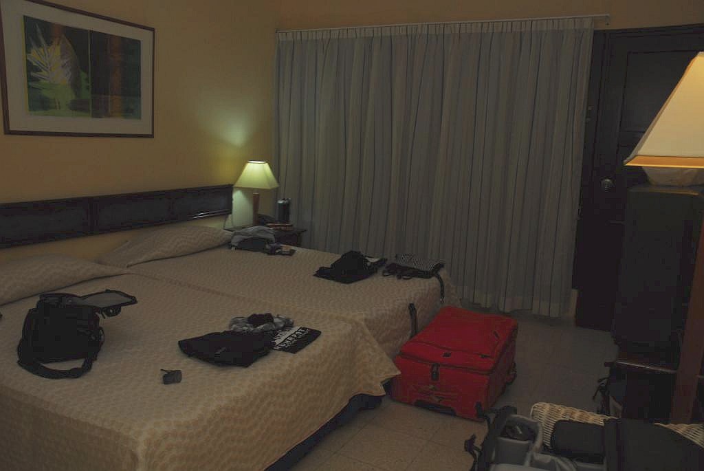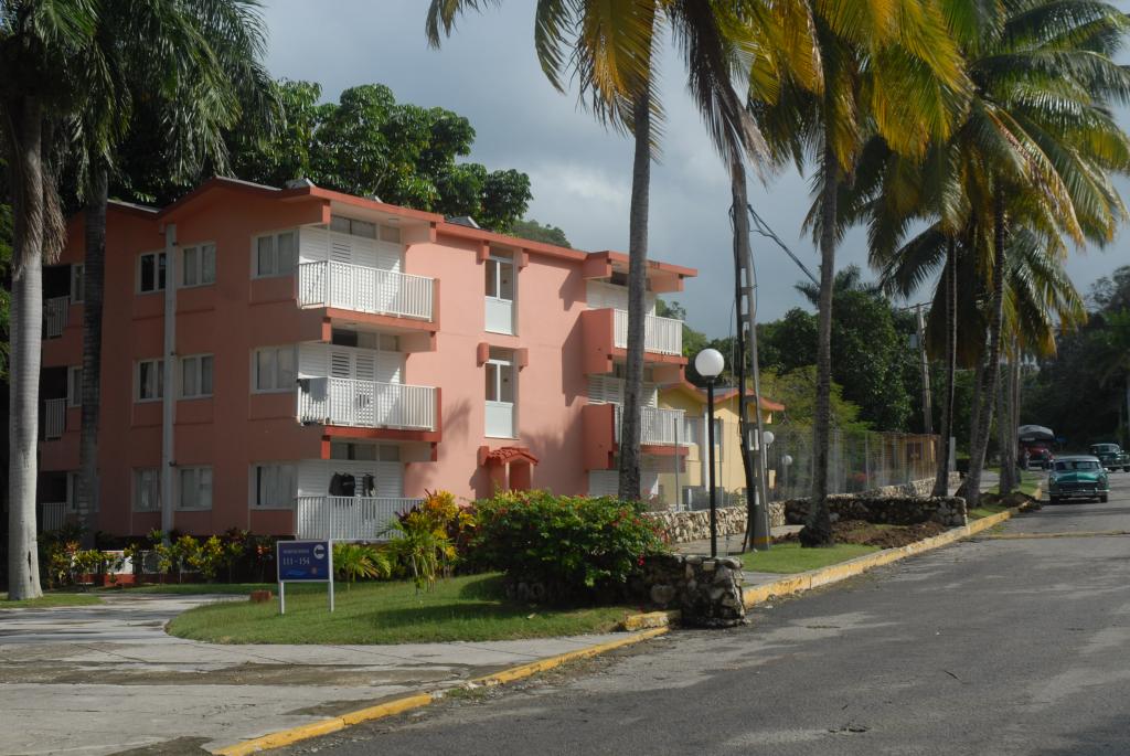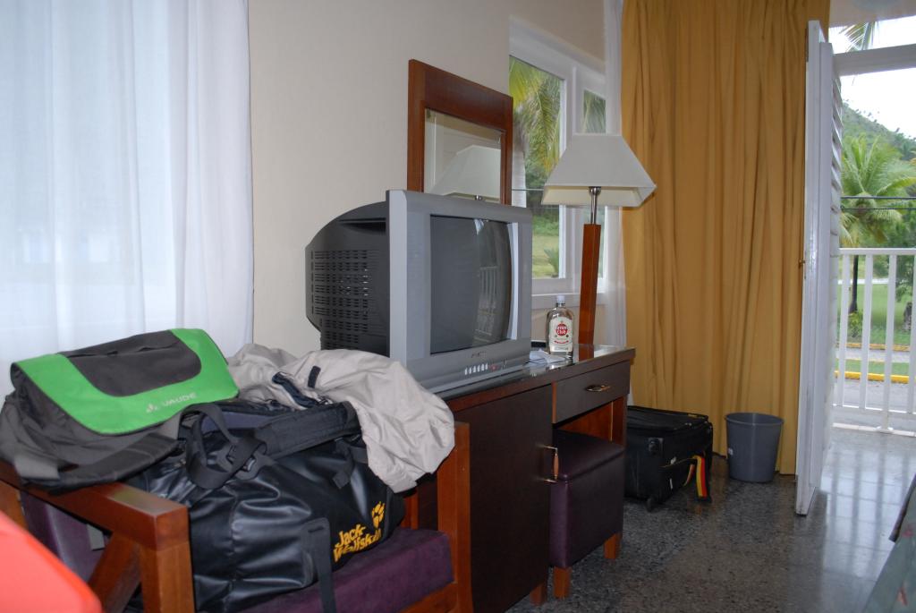 Die "Villa Tropico" in Jibacoa lag direkt am Sandstrand und hatte 3 Sterne. Es gab viele freistehende, kleine Wohneinheiten, doch wir hatten in einem mehrgeschossigen Haus ein Zimmer mit Balkon und Blick auf den Parkplatz. Es gab einen Fernseher mit deutscher Welle, Klimaanlage, Kühlschrank, einen Schreibtisch und ein Doppelbett. Was es mal wieder nicht gab, war ein Fahrstuhl.