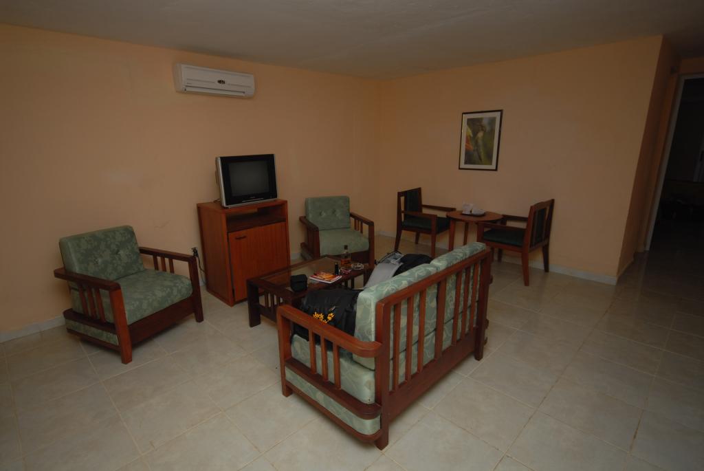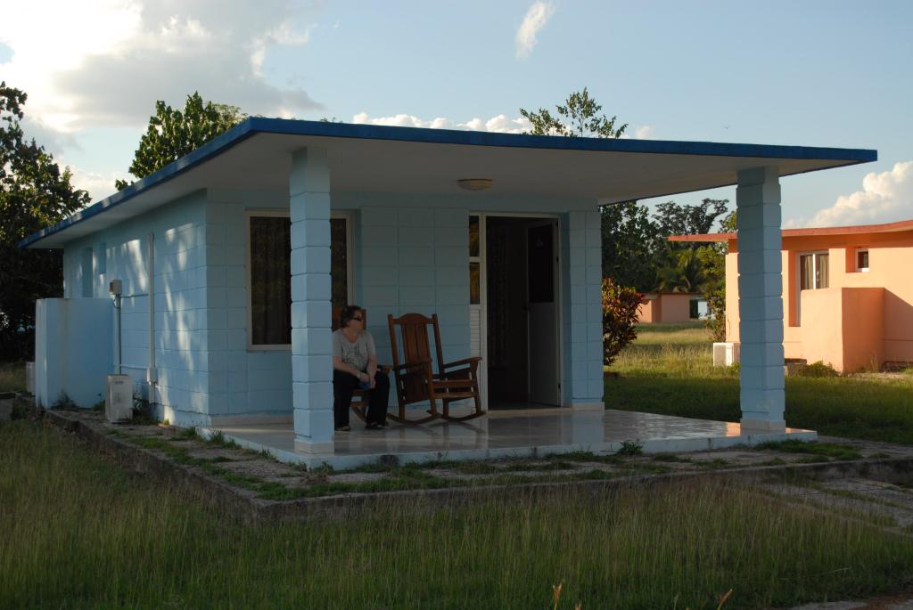 Das "Hotel Playa Larga" in Playa Larga hatte 2 Sterne und war eher ein Campingplatz an der Schweinebucht. Viele, einzelne kleine Häuser standen auf einem riesigen Gelände. So auch unser Haus 44. Es war riesig. Vom Eingang, vor dem sich eine große, überdachte Terrasse mit Schaukelstühlen befand, ging man in ein Wohnzimmer mit 7 Sitzplätzen und Fernseher. Der nächste Raum beinhaltete neben den Betten auch einen Safe und einen Kühlschrank.