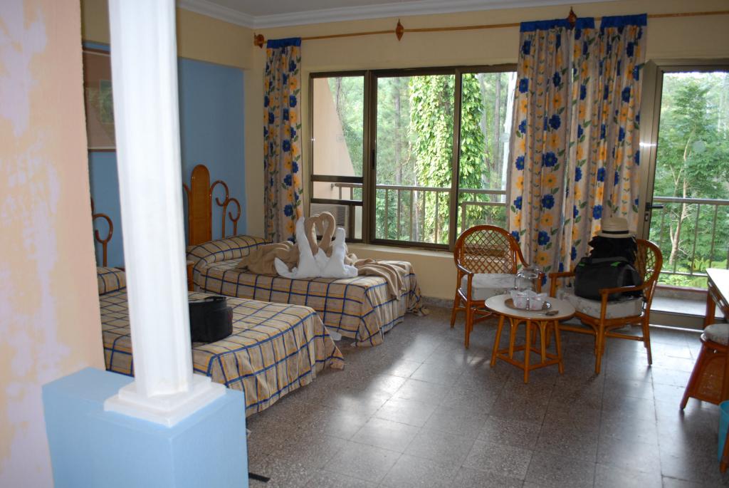 Das "Hotel Los Helechos" lag mitten im Wald und sehr abgelegen am Rand des Nationalparks und hatte 3 Sterne. Unser Zimmer mit Balkon und Steinböden hatte einen Vorraum und es war ausgestattet mit einem Kühlschrank, Einzelbetten, Fernseher und Klimaanlage. Das Bad mit (roter!) Dusche war innenliegend.