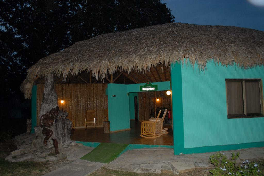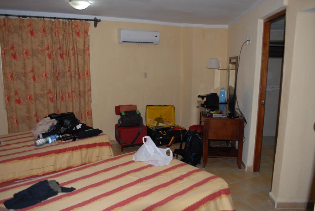 Das "Hotel Los Caneyes" lag etwas außerhalb von Santa Clara und hatte 3 Sterne. Jeweils 6 Zimmer bildeten eine Rundhütte mit einem Aufenthaltsbereich mit Schaukelstühlen in der Mitte. Das Zimmer war einfach, aber toll. Ausgestattet mit Warmwasser, Klimaanlage, Doppelbett und Flat-TV. Der Boden war hell gefliest und es gab sogar eine ebenerdige Dusche.