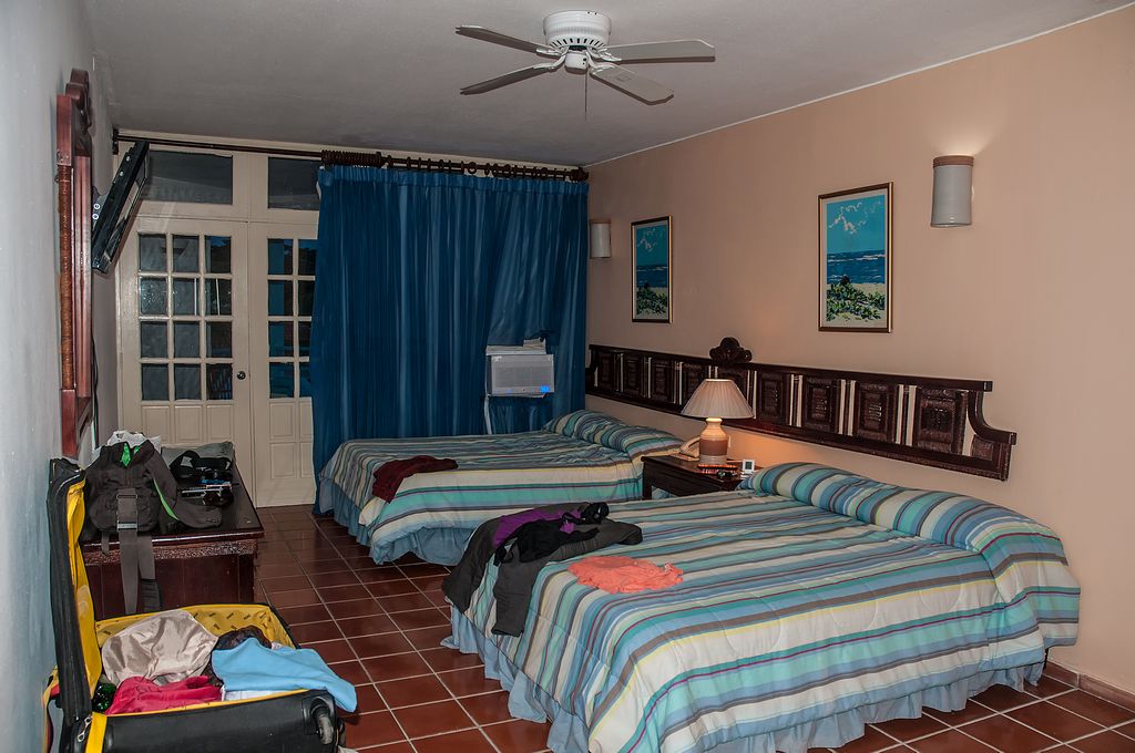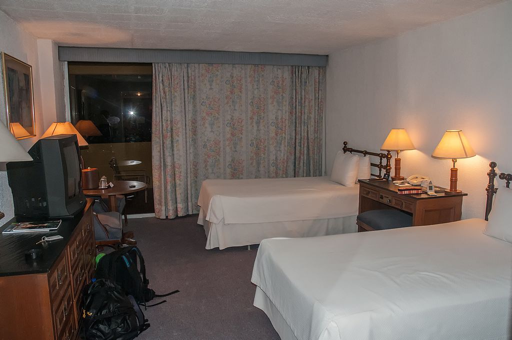 Es war gehobene Mittelklasse mit einem angrenzenden Casino und überfülltem Parkplatz vor dem Eingang, so dass wir kaum vorfahren konnten. Unser Zimmer war recht groß, lag in der 3.Etage eines Hochhauses und hatte einen großen Balkon mit Blick auf den Pool, Teppichboden und getrennte Betten. Es gab einen kleinen Röhren-Fernseher mit SAT, Aber nur DW in spanisch. Weiterhin einen leeren Minikühlschrank und eine Klimaanlage. Ein Aschenbecher auf dem Balkon fehlte.