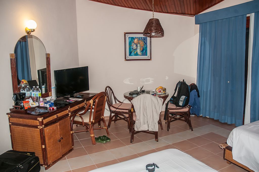 Wir hatten ein Zimmer in der ersten Etage ohne Fahrstuhl und Kofferträger. Es gab hier Einzelne Häuser mit wenigen Wohneinheiten. Bei unserem Zimmer war ein Balkon mit Sitzbank aber ohne Aschenbecher. Ausgestattet war das Zimmer mit Fliesenboden, TV (SAT mit deutscher Welle), Doppelbett und zusätzlichem Einzelbett. Einen Safe gab es gegen Gebühr. Das Bad hatte eine halb hoch gemauerter Dusche. Das Warmwasser funktionierte, aber es gabt kein Fön oder Duschartikel. Dafür genug nette Badgeckos am Fenster, die gegen die Mücken im Bad vorgingen.