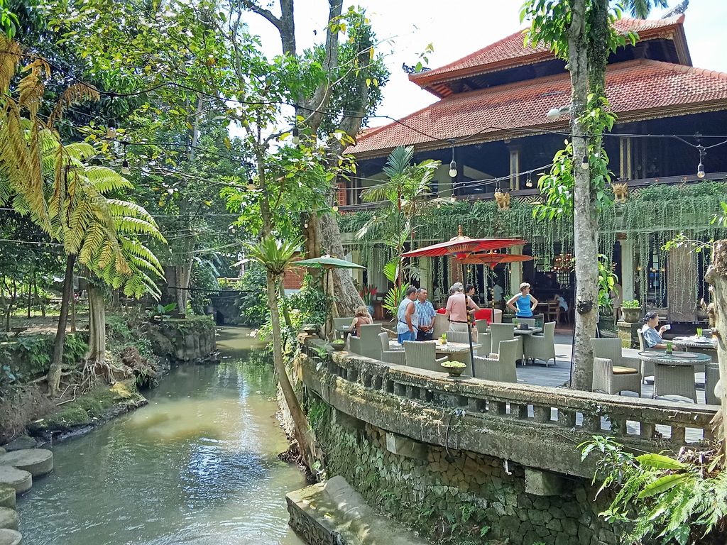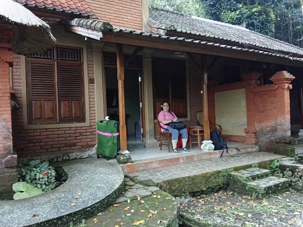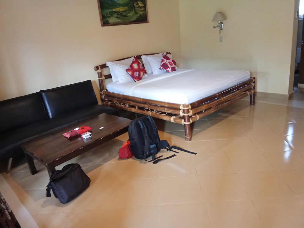 Das Arma Museum & Resort in Ubud (Bali) hatte 4 Sterne. Er war wie ein Dorf in der City. Auf verschiedenen Ebenen befanden sich die einzelnen Gebäude und dazwischen lagen Teiche mit Reis und Skulpturen. Wasserläufe durchzogen das Gelände. Es gab einen Pool und auch ein eigenes Kunstmuseum. Unser Zimmer in der zweiten Etage war über unzählige Treppen (ohne Aufzug) erreichbar. Wir hatten Blick vom Balkon auf den Pool, einen Schreibtisch, ein Doppelbett, einen leeren Kühlschrank, weis gefliesten Boden, TV und Klimaanlage. WLAN war natürlich auch überall vorhanden.