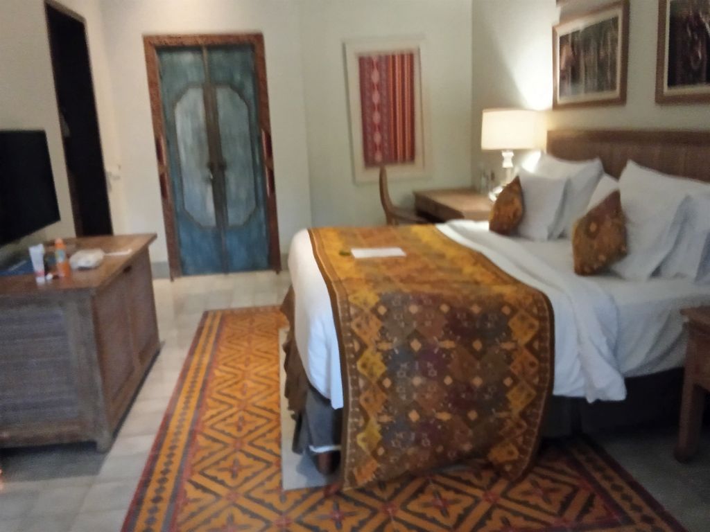 Das Sudamala Resort in Sanur (Bali) hatte 4 Sterne und lag in der zweiten Reihe des Strands. Die Anlage lag um zwei große Innenhöfe verteilt. In einem gab es einen Pool. Der andere war ein Garten mit Wiese und Sitzsäcken. Unser Zimmer im Erdgeschoss war wie eine Suite. Wir hatten einen eigenen Garten mit Terrasse und zweitem Eingang, Es gab einen Extraraum für die Koffer, ein Bad mit zwei getrennten Schiebetüren und einer offenen Dusche. Im Hauptraum war ein Ventilator unter der Decke und es gab eine Klimaanlage. Die Minibar war gefüllt und WLAN sowie TV waren auch vorhanden. Weiterhin gab es ein Doppelbett, Schreibtisch und eine Tür im balinesischen Stil (leider zu breit für Zuhause, ansonsten hätte ich sie geklaut).