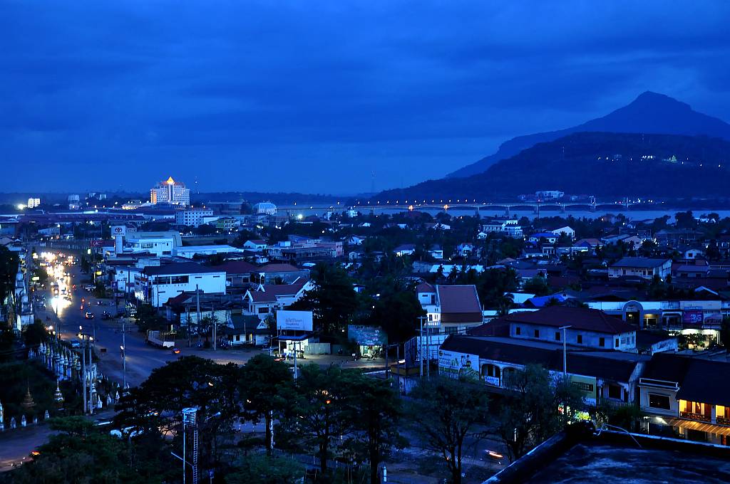 Sonnenuntergang auf dem Dach des Palace Hotels in Pakse, Laos.