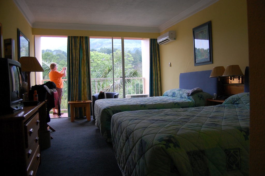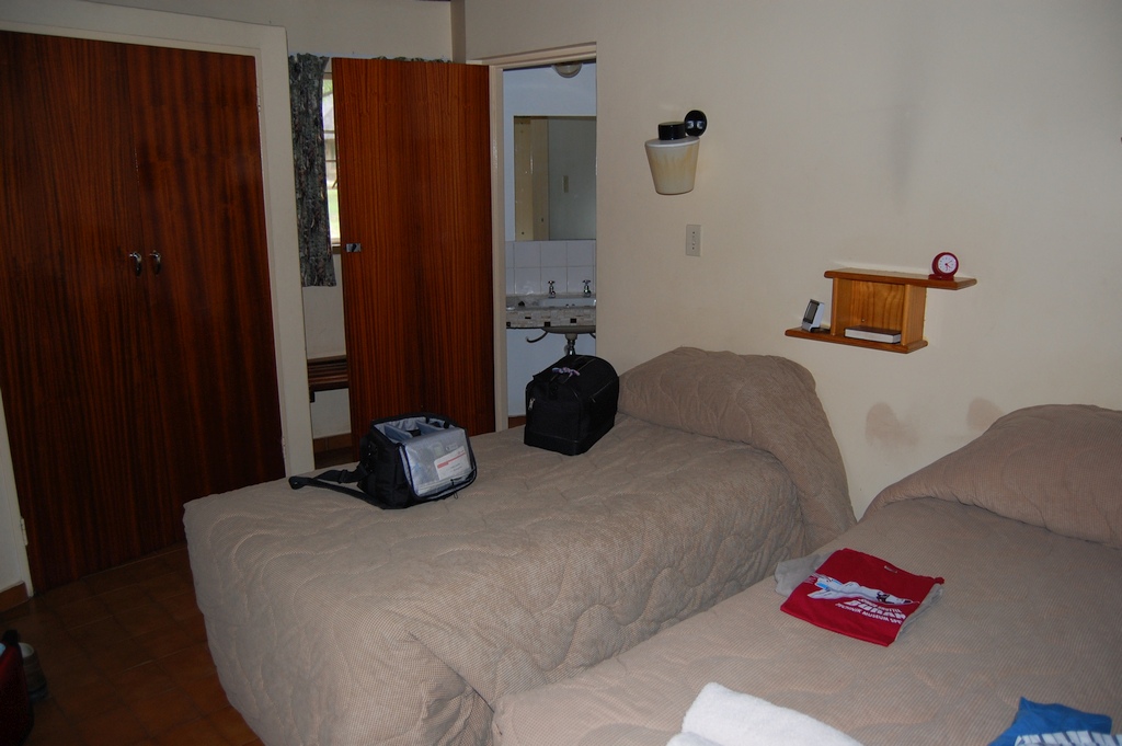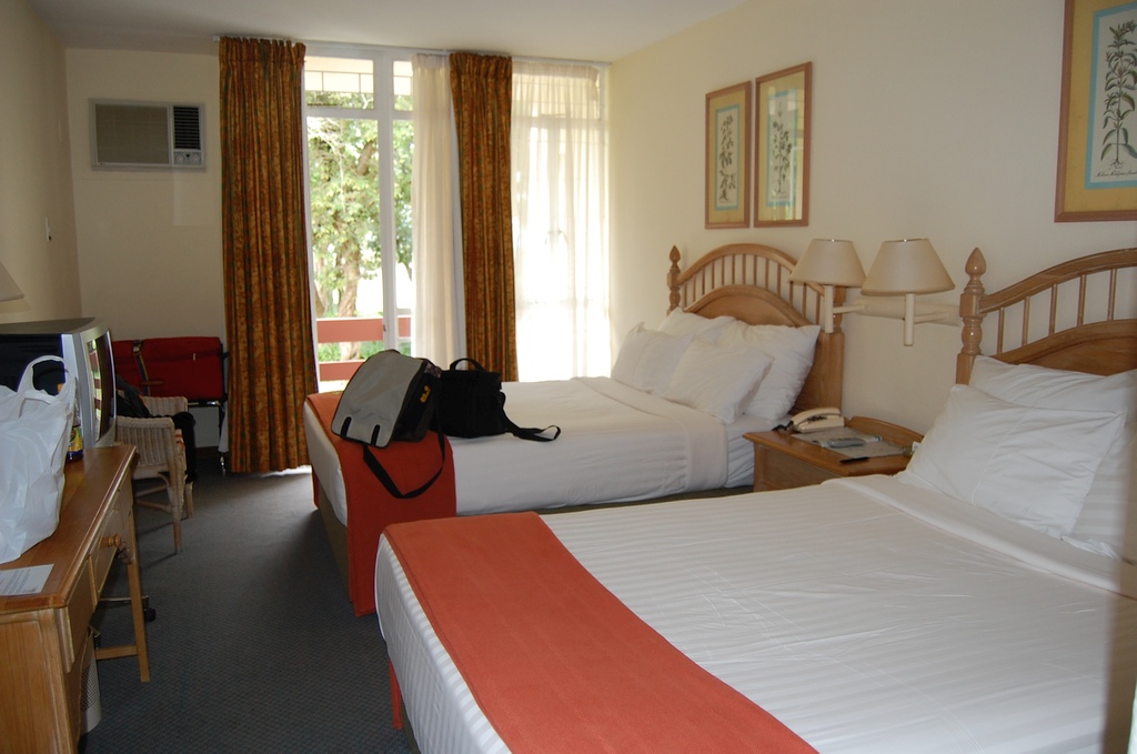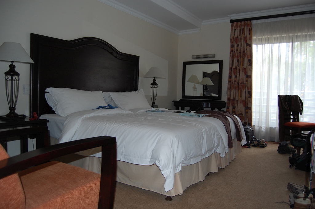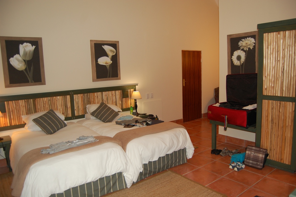 Unser Zimmer im Premier-Hotel in Pretoria war ausgestattet mit einem (leeren) Kühlschrank, LCD-TV, Klimaanlage, Safe, einen geräumigen Bad mit Dusche, Wanne und Fön. Der Raum hatte Teppichboden und das Fenster zeigte zur Hauptstrasse. Innerhalb des gesamten Hotels ist das Rauchen verboten. Es gab einen sehr kleinen Pool (1,1 bis 1,5 m tief) im kleinen Garten mit einer noch kleinerer Liegewiese, ein gutes Restaurant und eine ebenso gute Bar. Obwohl das Hotel direkt an einer Hauptstrasse lag, hört man den Strassenlärm kaum. Vor dem Hotel, dessen Zäune zusätzlich mit Natodraht geschützt waren, patroulierte ständig die Security des Hotels. Die Preise für das Essen im Hotel waren OK.