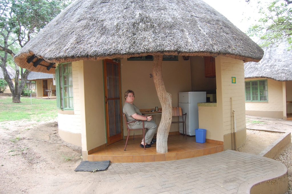 Das "Skukuza Rest Camp" hatte nur 2 Sterne, lag im Krüger-Nationalpark und bestandt aus vielen kleinen, gemauerten Rundhütten. Ein teures Restaurant und ein preiswerter Schnellimbiss gehörten zur Anlage wie auch ein Laden und eine Tankstelle. Unsere Rundhütte (Nr. 38) war ausgestattet mit einer kleinen Terrasse, Kühlschrank, Klimaanlage, Warmwasser, Dusche, WC, einem Gecko gegen Insekten und einem Grill vor der Tür. Abends brauchte man eine Taschenlampe, da die Wege im Camp nicht beleuchtet waren. Einen Fön mit passendem Adapterstecker sollte man ebenfalls selbst dabei haben, da es im Zimmer keinen gab.