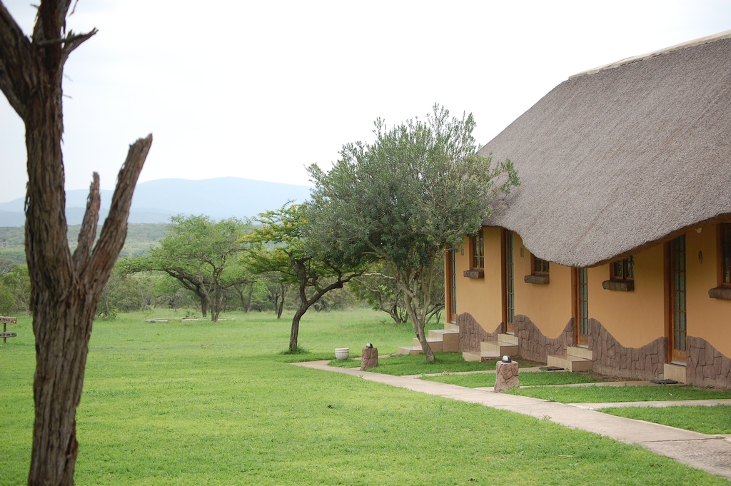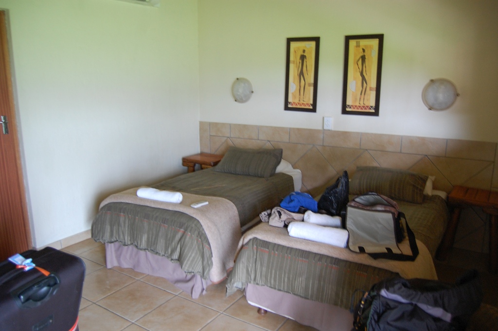 Die Bayala Game Lodge bei Hulhuwe hatte 3 Sterne und lag mitten in einem privaten Tierschutzgebiet. Über eine Schotterpiste von der N2 erreichte man die Lodge nach 20 Minuten Fahrt. Unser freistehender Bungalow hatte eine Klimaanlage, einen Wasserkocher, Dusche, zwei einzelne Betten, Warmwasser und einen Schreibtisch. Es fehlte ein Safe und ein Kühlschrank. Ein Pool war auf der Anlage vorhanden. Das abentliche Barbecue im freien konnte uns nicht besonders überzeugen (auf einem Holzkohlegrill, der mit Benzin angezündet wurde, gab es verkokeltes, fettes und sehniges Fleisch, das dazu nach Benzin roch). Auch waren nachts im Camp extrem viele Käfer unterwegs, die sich von den Dächern auf die Teller fallen liessen. Wenigstens gibt`s kaltes und preiswertes Bier an der Bar.