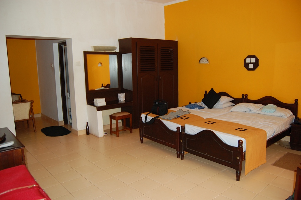 Das 'Jetwing Blue Oceanic' in Negombo hatte 3 1/2 Sterne. Unsere Zimmer (wir waren 2x in diesem Hotel) Nr. 2026 bzw. 2032 waren ausgestattet mit einer lärmenden Klimaanlage, einem kleinen Kühlschrank, einem grossen Balkon mit Sitzgelegenheiten, einem Doppelbett auf einem Beton-Sockel, einer Sitzecke, SAT-TV (Röhrengerät), Aschenbecher (also Rauchen erlaubt), einem Deckenventilator und wir hatten vom Balkon aus Blick auf den Strand. Die Einrichtung war aber alt und einfach. Es fehlte uns ein Fön im Bad und es gab nur einen mini-Pool. Direkt gegenüber befindet sich ein 'Wine-Store', wo es preiswert Bier in Pfandflaschen zu kaufen gab.