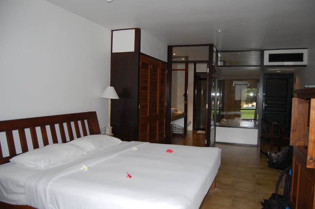 Unser Bungalow hatte ein halboffenes Bad mit Dusche und WC, eine Terasse mit Liegestühlen und Blick auf das Meer, Klimaanlage, einen Deckenventilator, Radio und eine Sitzecke. Der Fußboden war gefliest. Achenbecher waren vorhanden also war auch Rauchen im Bungalow erlaubt. Einen Fernseher oder einen Safe gab es nicht. Nur im Hauptgebäude. Aber wer brauchte sowas hier?