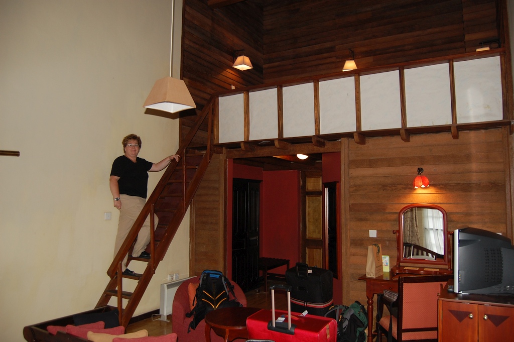 Unser Nichtraucherzimmer hatte (neben wergitterten Fenstern) einen Boden aus Tropenholz, Klimaanlage, Heizung, eine Sitzecke, TV, einen Save und einen Schreibtisch. Das Zimmer reichte über 2 Etagen. In der oberen Etage waren ebenfalls 2 Betten vorhanden.